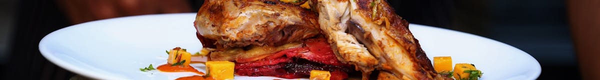 Vepřová panenka (sous vide) s višňovou omáčkou, bramborovými plackami a grilovaným hroznovým vínem